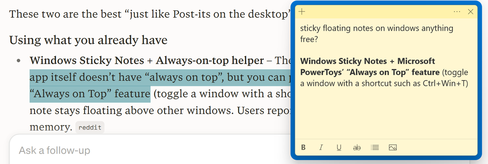 - Now that small note will float above your browser, PDFs, and other windows until you press the shortcut again.